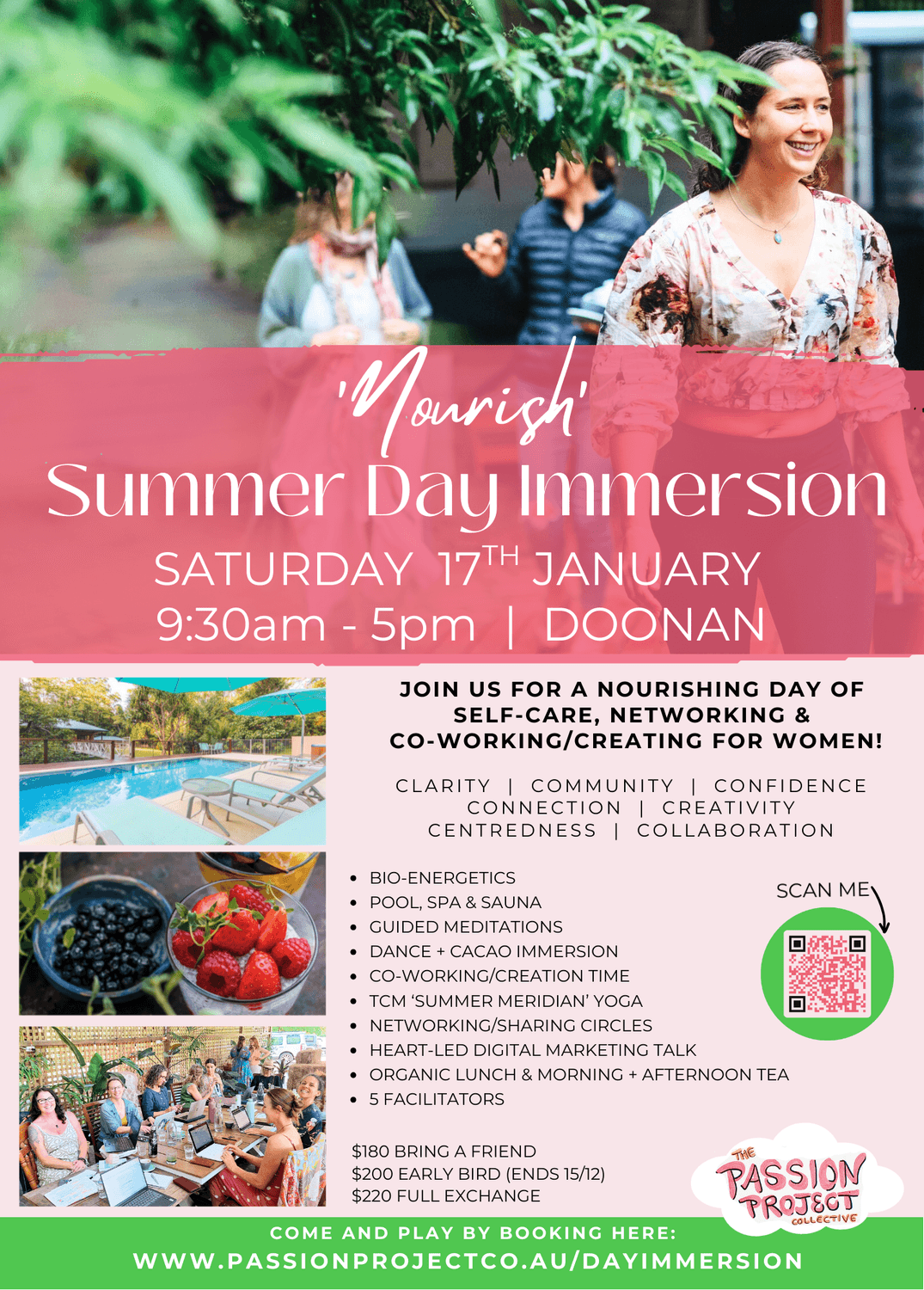The flow of the day will be similar to our flow of the Passion Project Co Friday mornings though including a nourishing organic feast for lunch, morning & afternoon tea, 'Day Spa' experience, heart-led presentations (on digital marketing and bioenergetics), more time for movement, meditation and sharing circles with five fabulous facilitators.